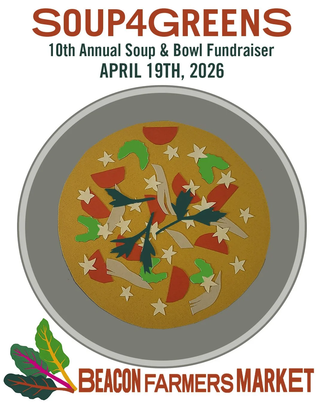The Beacon Farmers’ Market annual food access fundraiser Soup4Greens is Sunday, April 19th from 10am to 2pm. Join us for handcrafted bowls, savory soups, all for a great cause!