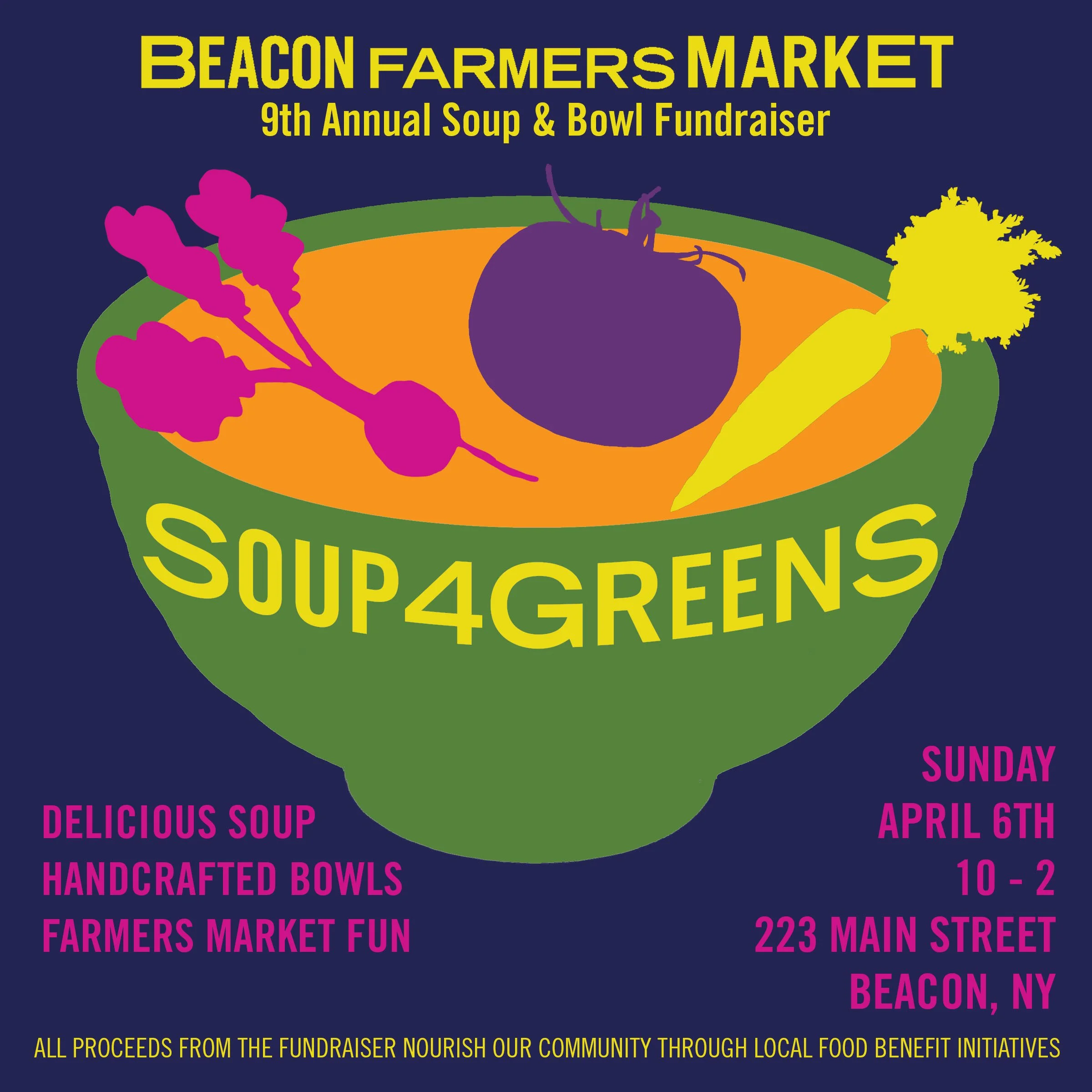 Soup4Greens is a fundraising event on Sunday, April 6 at the Beacon Farmers’ Market. We will be selling fresh and frozen soups as well as locally handmade bowls.